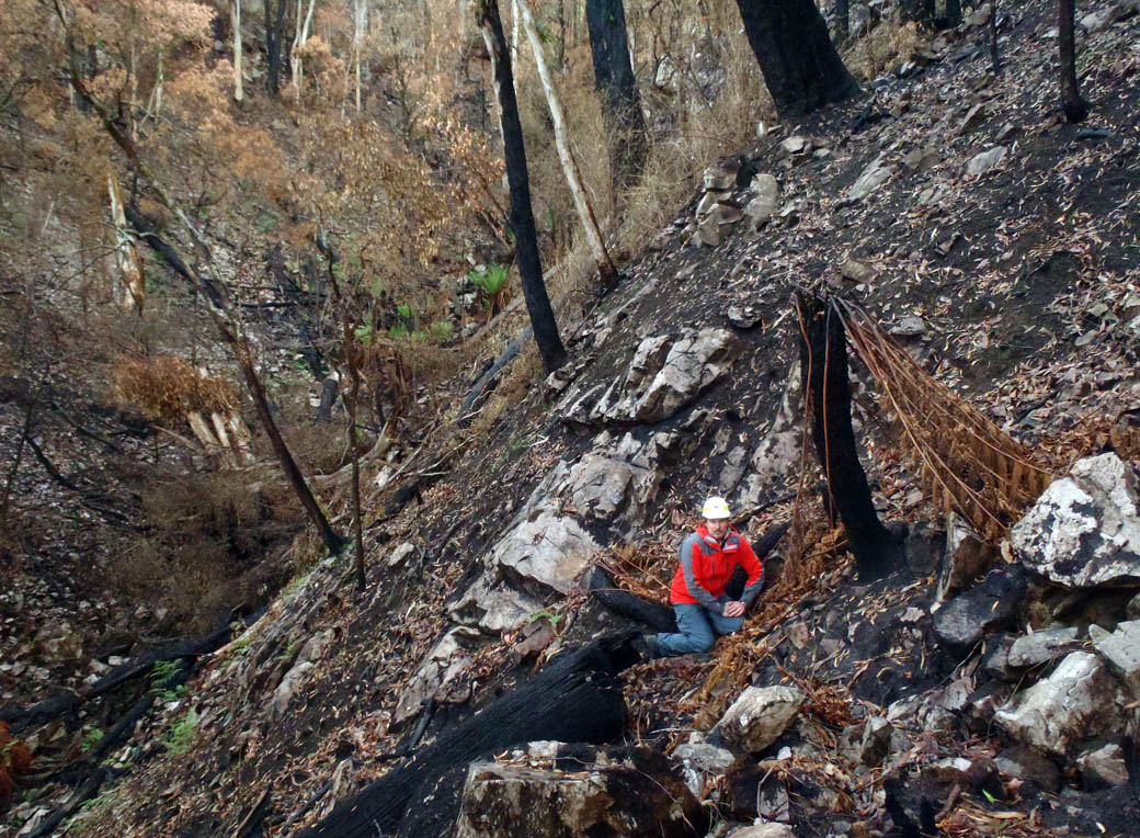 There are several hypothesised causes of decline in smoky mice, most notably drought, foxes, feral cats, and fire – all of which play major roles in the Grampians-Gariwerd National Park. My Masters research focused on a smoky mouse population in the Victoria Range, in the west of the park. In November 2012, as part of a team from Museum Victoria and Parks Victoria we surveyed one of the historical smoky mouse sites in the Victoria Range as part of a broader survey of the Grampians. We detected an astounding 28 individuals at the one site, now affectionately known as ‘Supergully,’ – a record high number in the Victoria Range. Three months later Supergully burned in the Victoria Valley fire, along with all other historical smoky mouse sites in the Victoria Range.